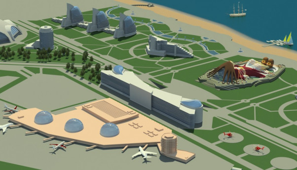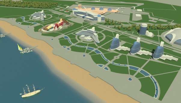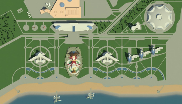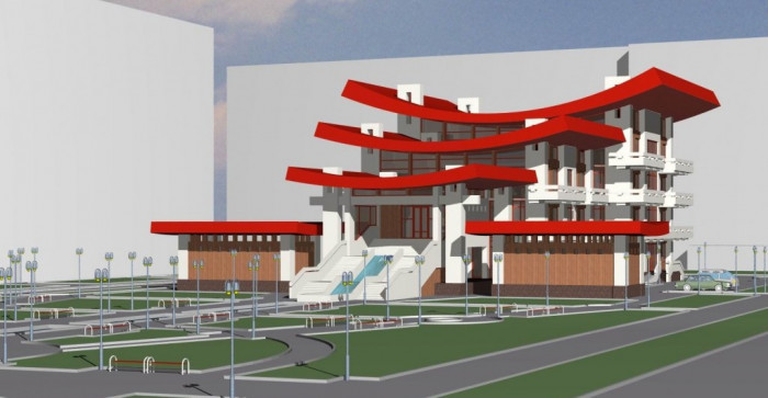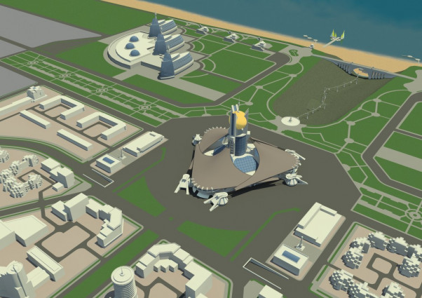 В проекте проработаны важнейшие вопросы, связанные с организацией композиционно законченного пространства в районе развитой транспортной развязки у Водонапорной башни. Объёмно-пространственная композиция сооружения построена вокруг башни на расстоянии 25 метров от её стен. Предлагаемое архитектурное решение придаёт объекту индивидуальность и художественную выразительность.