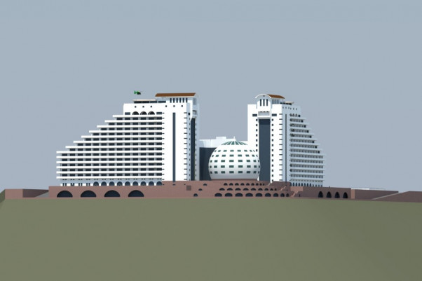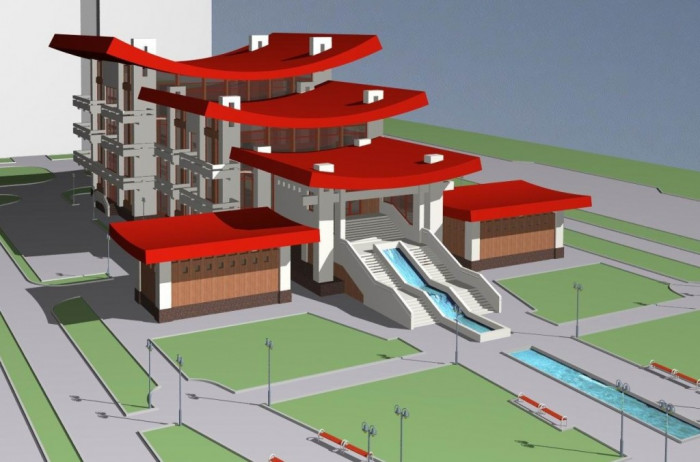 В проекте проработаны важнейшие вопросы, связанные с организацией композиционно законченного пространства в районе развитой транспортной развязки у Водонапорной башни. Объёмно-пространственная композиция сооружения построена вокруг башни на расстоянии 25 метров от её стен. Предлагаемое архитектурное решение придаёт объекту индивидуальность и художественную выразительность.